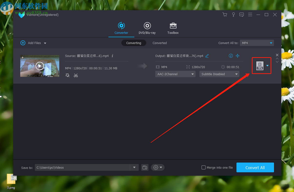 3.点击打开按钮之后我们在主界面中点击右边转换视频选项中的MP4这个视频格式图标,如下图中所示。