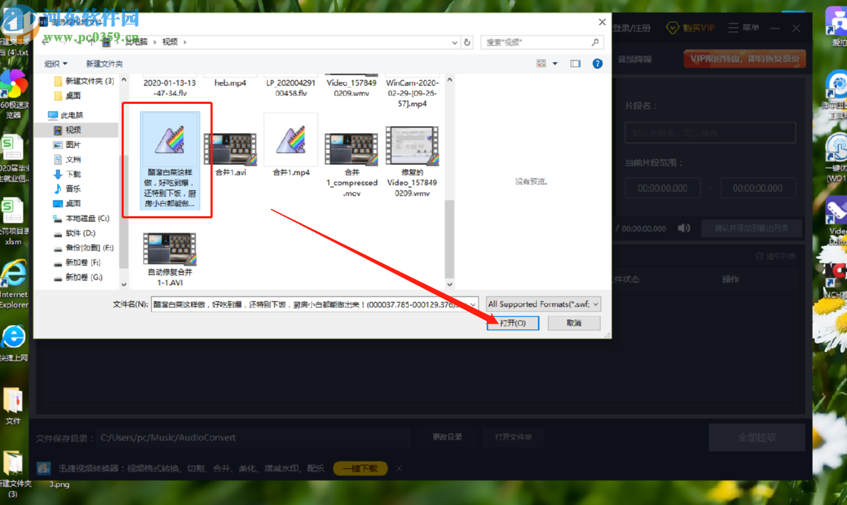 2.点击添加文件按钮之后,我们在出现的选择文件界面中,选中想要提取音频的那一个视频文件,选中之后点击打开按钮。