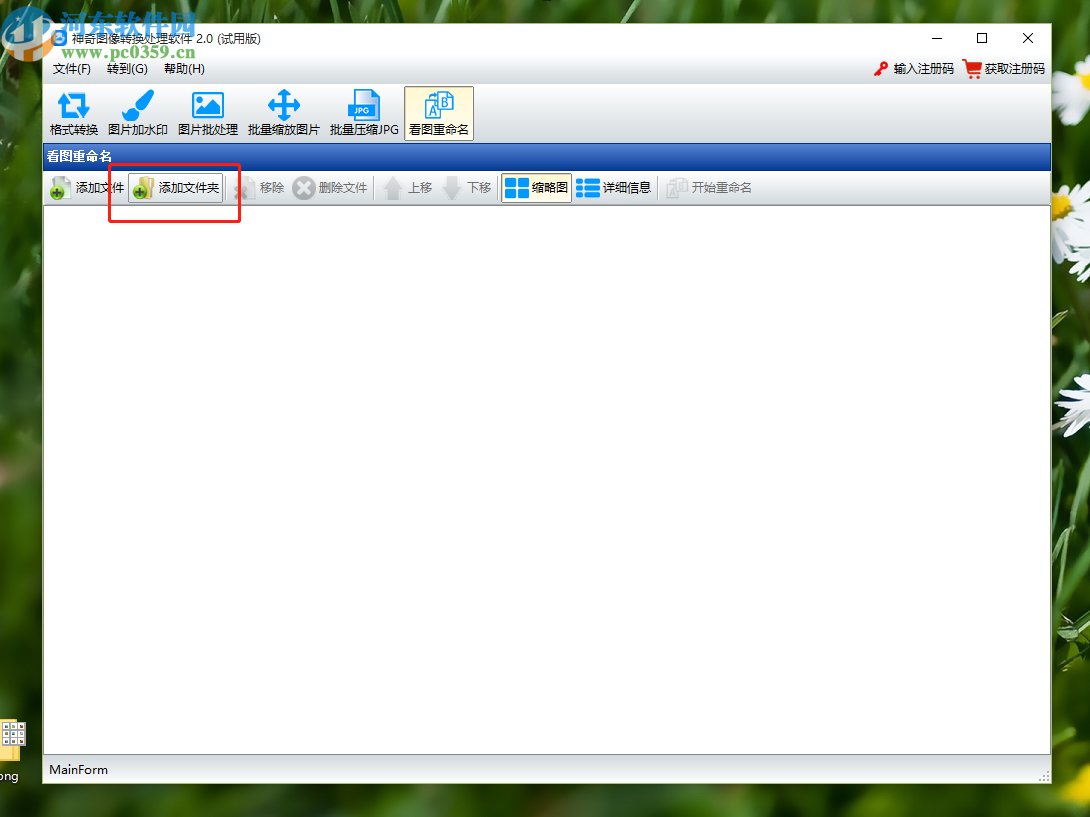 1.首先第一步我们点击选择界面上方的这个看图重命名功能之后,点击界面中的添加文件夹按钮。