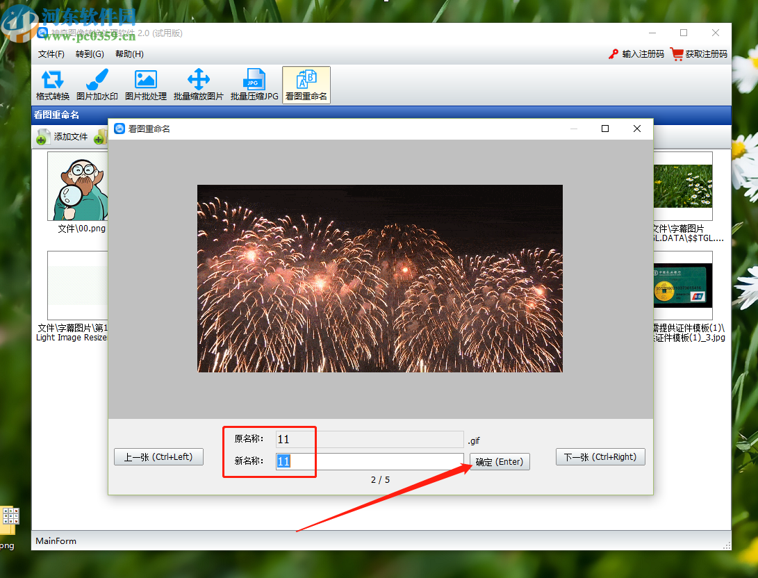 4.点击开始重命名按钮之后来到重命名文件的界面,可以看到图片的内容,下方有图片原名称和新名称,我们在新名称处输入想要修改的名称然后点击确定按钮。