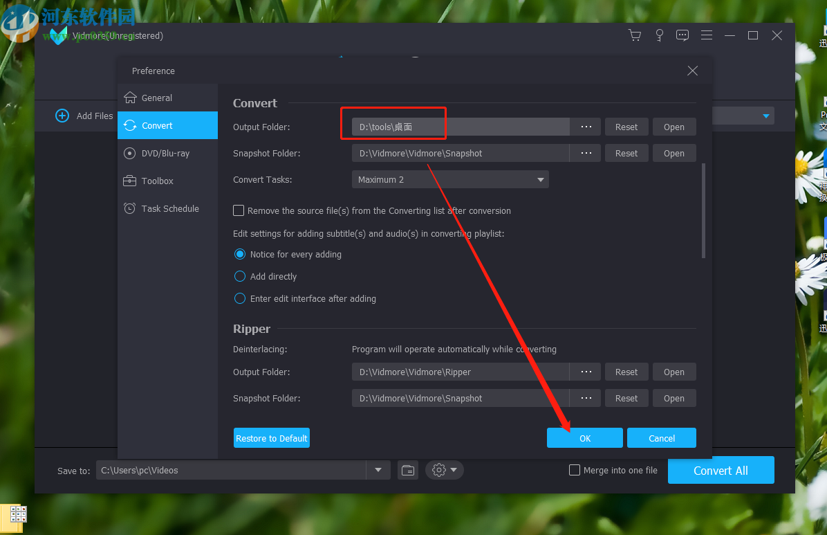 6.点击这个选择文件夹按钮我们就设置好想要的默认输出文件夹了,点击设置界面右下方的OK按钮即可保存这个设置。
