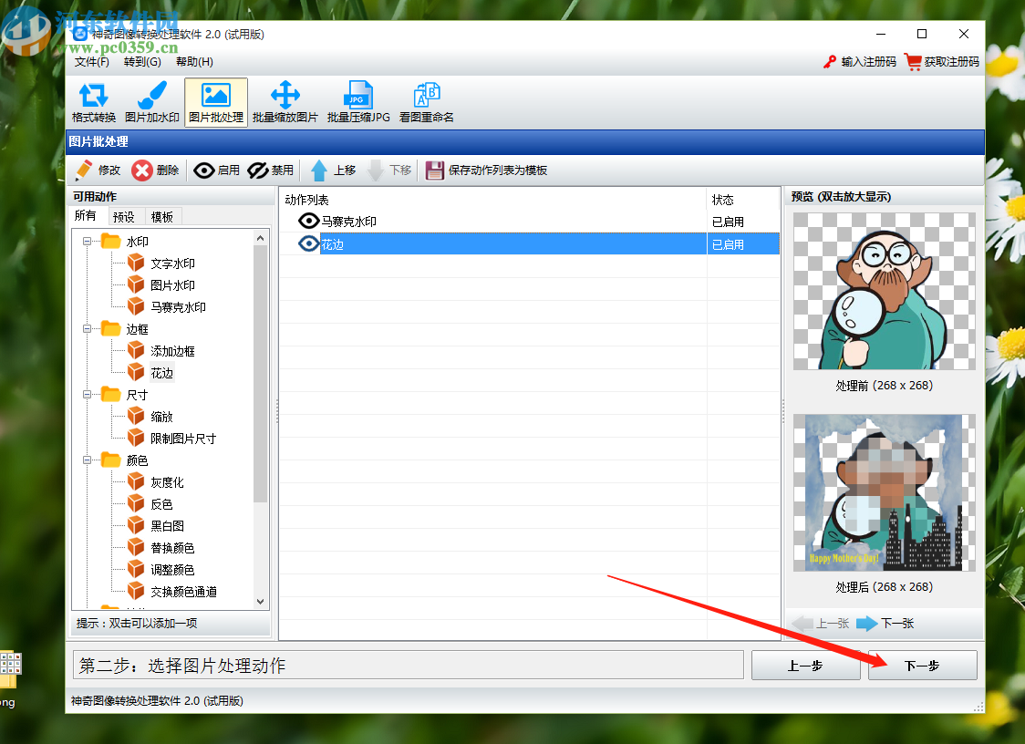 6.点击确定按钮之后这个添加图片花边的功能就设置好了,我们点击界面右下角的下一步按钮即可进入到下一步操作。