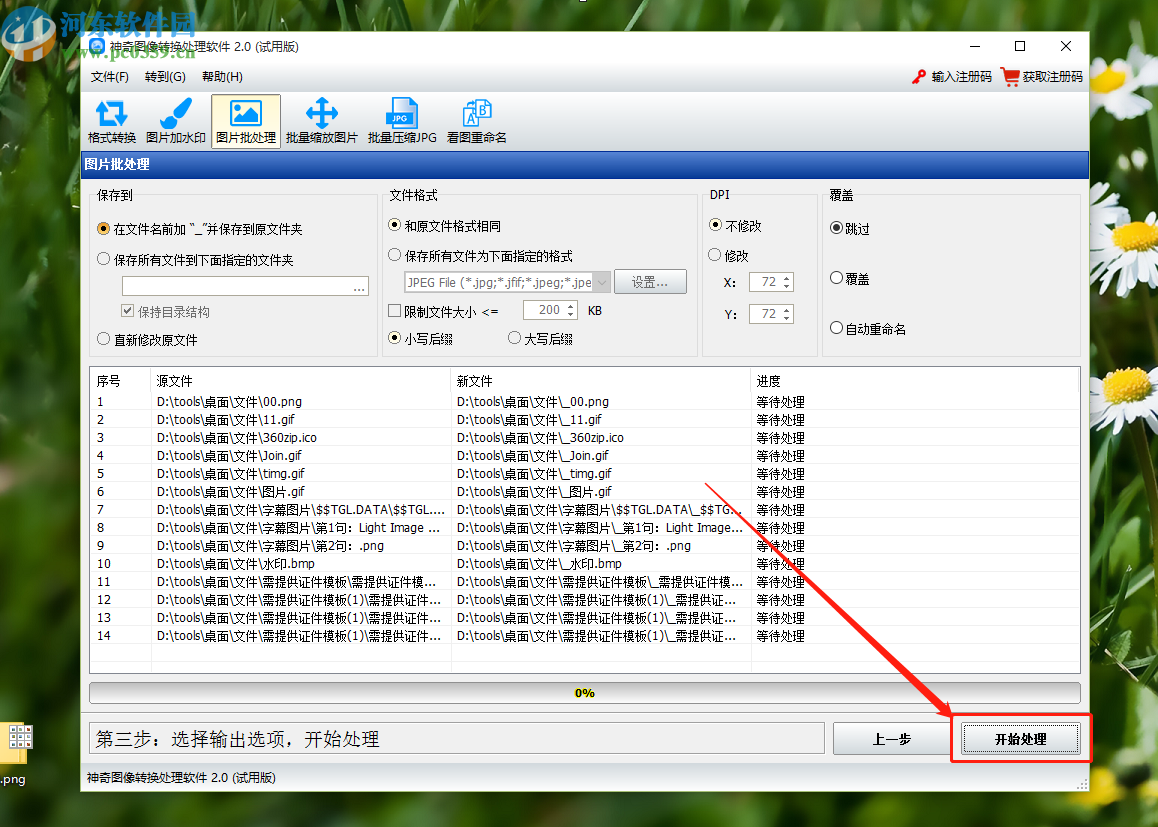 7.点击进入到下一步操作之后,我们可以在界面中设置文件的格式,设置完成之后点击界面右下角的开始处理按钮即可开始批量给图片添加花边。