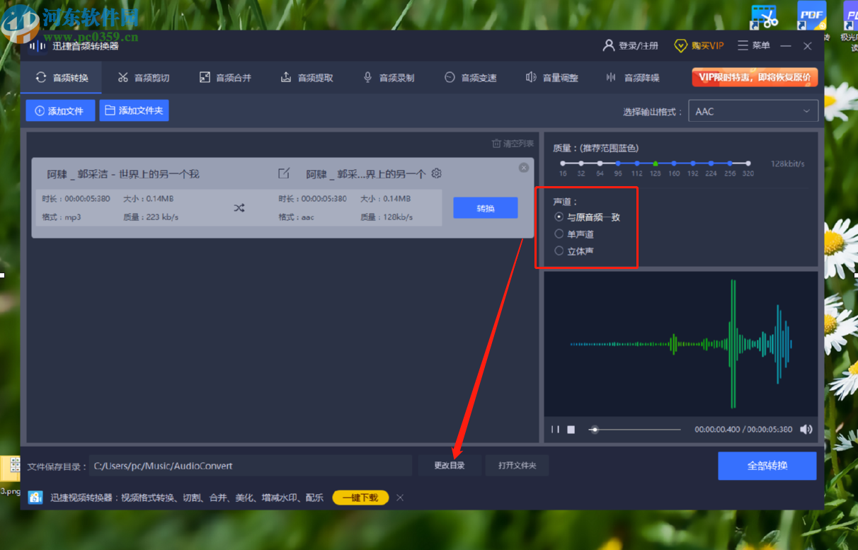 4.点击选择好想要转换的格式之后,下一步我们在声道这个位置可以设置音频转换之后的声道选项,接着点击下方的更改目录按钮。