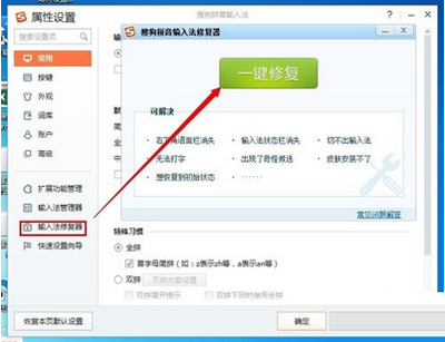 在搜狗拼音输入法属性设置下面点击【输入法修复】再点【一键修复】;
