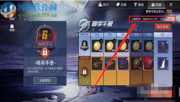 4.最后在购买赛季手册的界面中我们就可以看到当前赛季的结束时间了,如下图中所示,在购买等级这个按钮的上方。