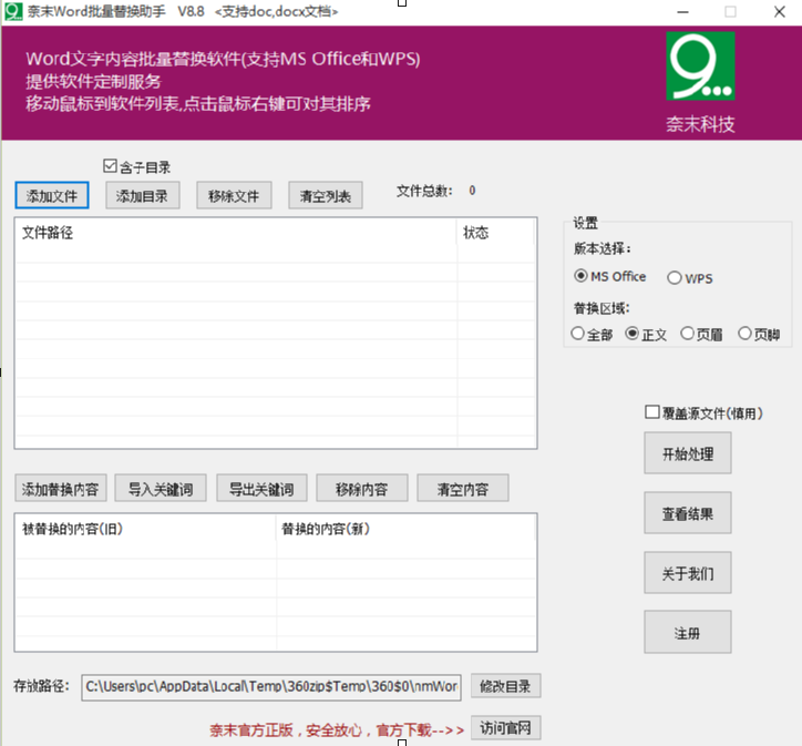 奈末Word批量替换助手是一款能够帮助用户批量替换Word文档的替换工具,在这款软件中可以选择用户想要替换的区域,就比如Word文档中的正文、页眉和页脚,如果用户在编辑Word文