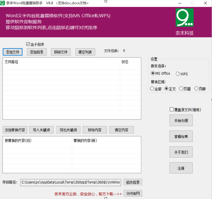 奈末Word批量替换助手是一款专门为替换Word文档内容而打造的文件工具,它可以帮助用户在电脑上替换Word文档的内容,其中可以批量对Word文档进行处理,如果用户有多个文档的内