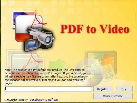 A-PDFToVideo是一款能够帮助用户将PDF文件转换为视频的转换工具,用户在查看PDF文件时需要一直用到翻页的操作,这样的话会比较麻烦,那么使用这款软件将PDF文件转换成视频