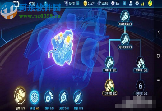 1.首先幻影战神这款赛车的改装方案都是全部向左改动,其中的引擎这一项就是向左边的幻影来改动就可以了,接下来的传动系统没有分支,向左改就行。