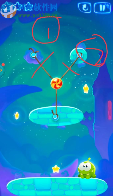 2.紧接着下一步我们需要割掉右边的这一条绳子,如下图中序号2处标注的位置,我们割掉这条绳子之后小球就会因为重力而翻滚,吃到左边的一个星星。