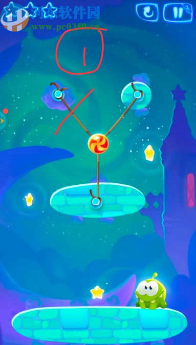 1.首先第一步我们进入到游戏第二关的界面之后,需要先割掉左上方的这条绳子,如下图中所示,割掉之后右边的星星就可以吃掉。