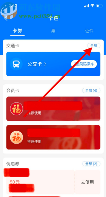 2.进入到卡包界面之后就可以看到已经有的公交卡了,然后我们点击全部图标。