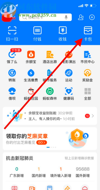 1.首先第一步我们打开支付宝APP界面之后,在主界面中找到卡包,然后点击进入到卡包中。