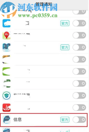 3.进入到手机的管理通知界面之后,我们就可以在界面中找到手机自带的信息这个功能,然后将他后面的通知开关开启就可以了。