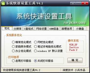 本软件用于windows XP系统快速优化,用最简单的方式实现对系统的快速设置。