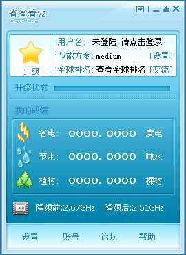 省省看是全球首款中文公益环保软件,它能够直接快速的帮助你节约电力开支,延长电脑寿命。省省看不仅仅将电脑视为对电力资源的节约,它还将电力资源以量化的形式转化为树木,石油等非可再生资源,以增强人们的环境和能源保护意识。您不需要太多的电脑知识就可以对该软件操作自如,省省看告诉你省电就是那么简单。