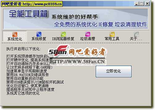 集合系统优化,IE修复,系统修复,垃圾清理,等常用功能的小软件.