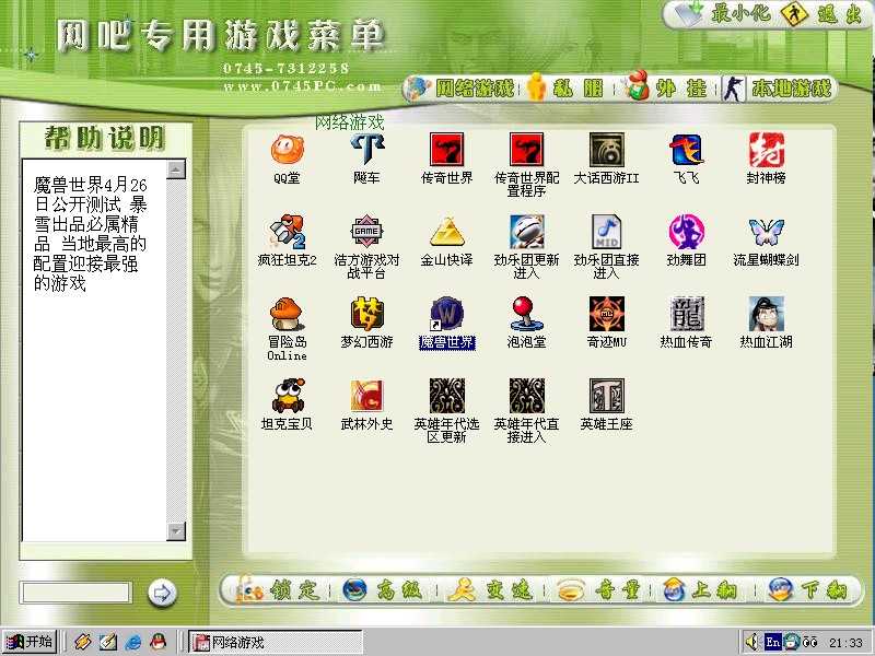 优点:将此菜单放到服务器上,工作站就建这四个程序的快捷方式,然后自己改个好看的图标,放到桌面上,以后更新了什么游戏,直接在指定的路径下放快捷方式就好了,有盘网吧不必要去搞什么同步桌面啊,什么的,麻烦!而且使您的桌面更直观简洁,不要是满桌面图标,分都分不清楚。