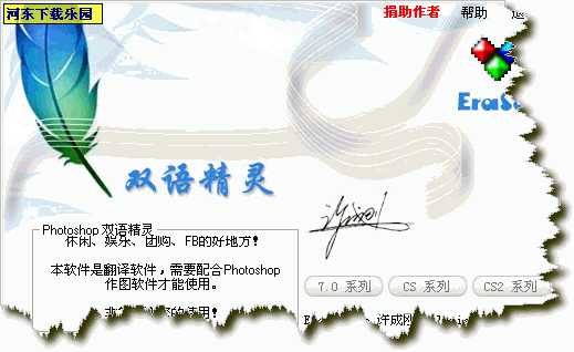本软件具有使用方便,是一个名符其实的绿色软件。当您运行本软件时,只需单击其中的中文版或者英文版按钮,双语精灵程序就会自动为您生成并打开相应语言版本的Adobe PhotoShop7.0 或 Photoshop CS 程序,而且还会使Adobe PhotoShop7.0 或 Photoshop CS 自动记录您最后使用的语言界面,也就是说,如果您直接打开Adobe PhotoShop7.0 或 Photoshop CS ,Adobe PhotoShop7.0 或 Photoshop CS 会按照您最后使用的语言界面显示,使您使用更便捷。 软件的优点: 本程序的最大优点为绿色软件,只有一个文件,不修改原有的任何文件,保持系统及软件的稳定性,还有最重要的就是免费提供给喜爱PhotoShop的人! [重要提示] 本软件是翻译软件,并非做图软件,需要配合PhotoShop做图程序才可以使用,是用来翻译PhotoShop英文版的,请初学者不要弄混,仔细看清。