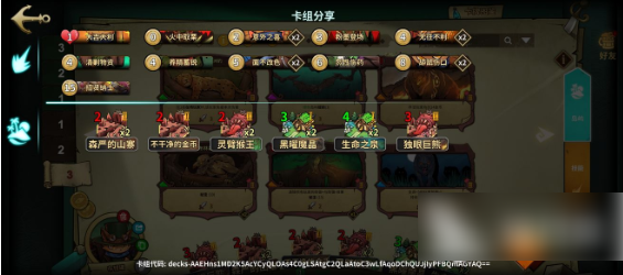 卡组组成:大吉大利、火中取栗、意外之喜X2、粉墨登场、无往不利X2、清缴物资、养精蓄锐、面部改色X2、烈性伤药、舔舐伤口X2、招贤纳士;森严的山寨、不干净的金币、灵臂猴王X2、黑曜魔晶X2、生命之泉X2、独眼巨熊。